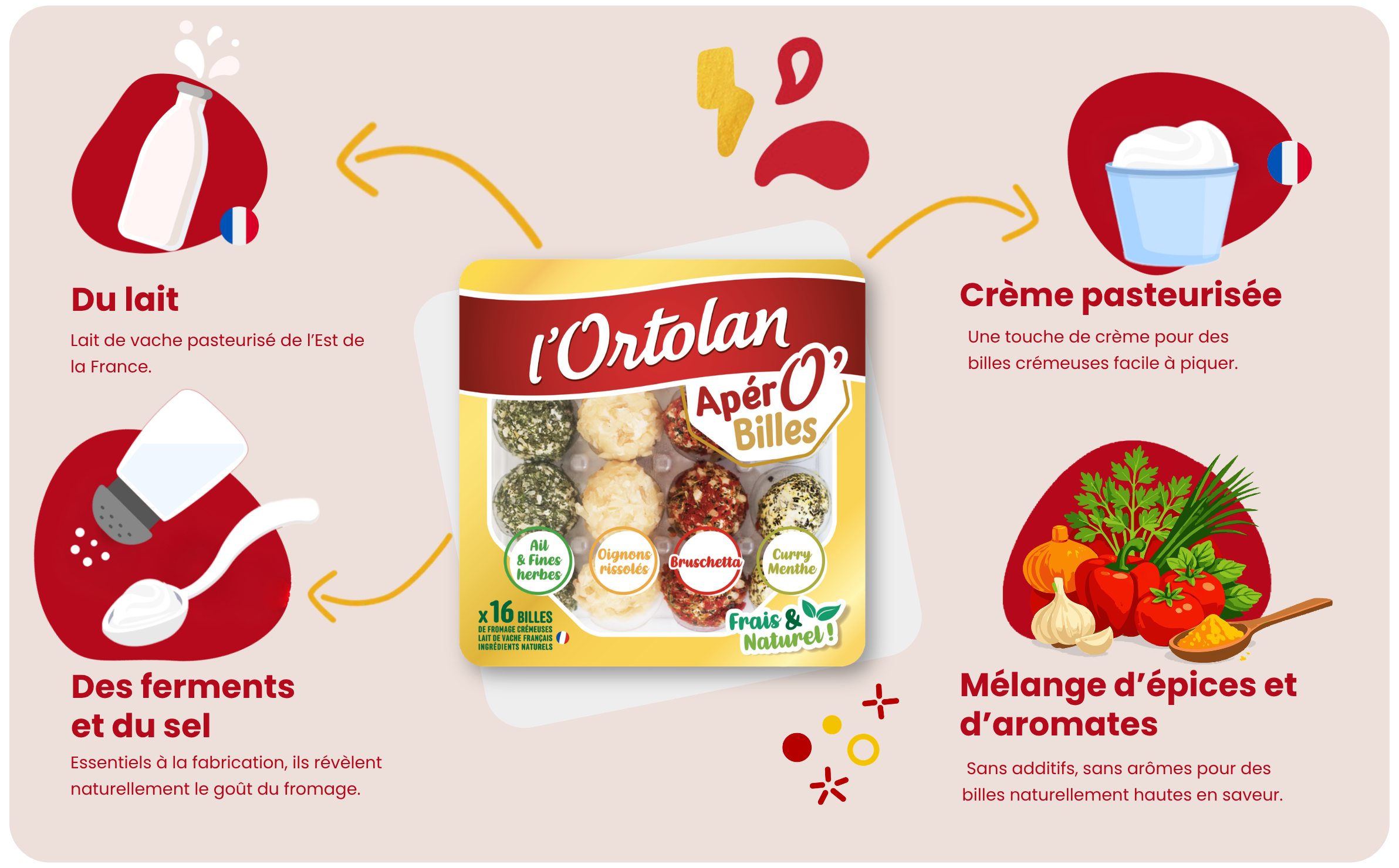 Billes ail et fines herbes : Fromage, ail (1.6%), ciboulette (1.2%), persil (0.8%), poivre noir.